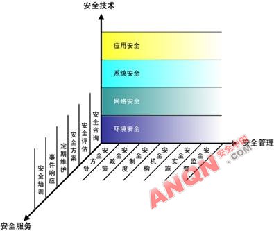 基于以上的分析和從家庭健康保障措施中得到的啟示,我們提出一種三維的信息安全保障體系,包括安全技術、安全服務和安全管理三個方面。信息安全是技術、服務和管理的統(tǒng)一,信息安全保障體系的建立必須同時關注這三方面。安全技術是整個信息系統(tǒng)安全保障體系的基礎,由專業(yè)安全服務廠商提供的安全服務是信息系統(tǒng)安全的保障手段,信息系統(tǒng)內(nèi)部的安全管理是安全技術有效發(fā)揮作用的關鍵。