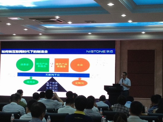 邱興錦總經(jīng)理首先對“如何做互聯(lián)網(wǎng)時代下的制造業(yè)”議題進行闡述,并結合樂石現(xiàn)有行業(yè)研究提出“制造業(yè)兩化融合解決方案”。其次,邱總分享了樂石團隊幫助九牧建立的生產管理系統(tǒng)、CRM、OA平臺、五星定制系統(tǒng)等。最后,邱總就九牧MES實施的組織結構、MES系統(tǒng)功能、MES流程清單、MES效益分析等內容進行詳細介紹。