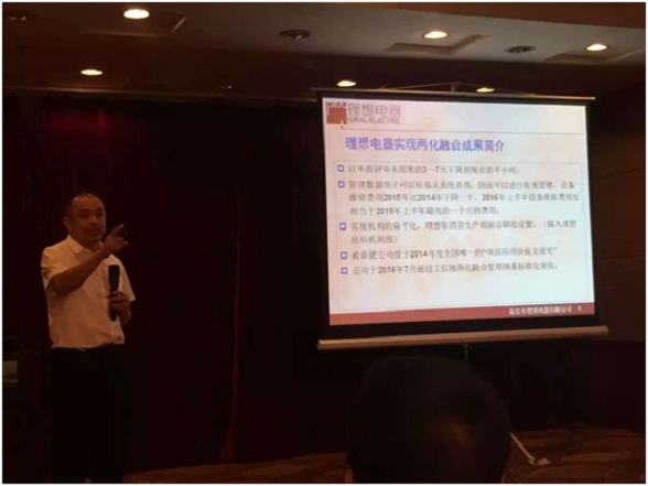 會上,首先由來自福安理想電器有限公司董事長鄭文生先生分享企業(yè)兩化融合成效與貫標經驗。鄭文生先生介紹了理想電器經過兩化融合貫標后的各項成效:一是理想電器的訂單評審由原來的3-7天下降到現(xiàn)在的半小時;二是管理數(shù)據(jù)統(tǒng)計利用的提升;三是機構扁平化,企業(yè)取消管生產副總職位等等。鄭文生先生還介紹了理想電器為什么要進行兩化融合,以及理想電器的兩化融合實施管理理念分享。