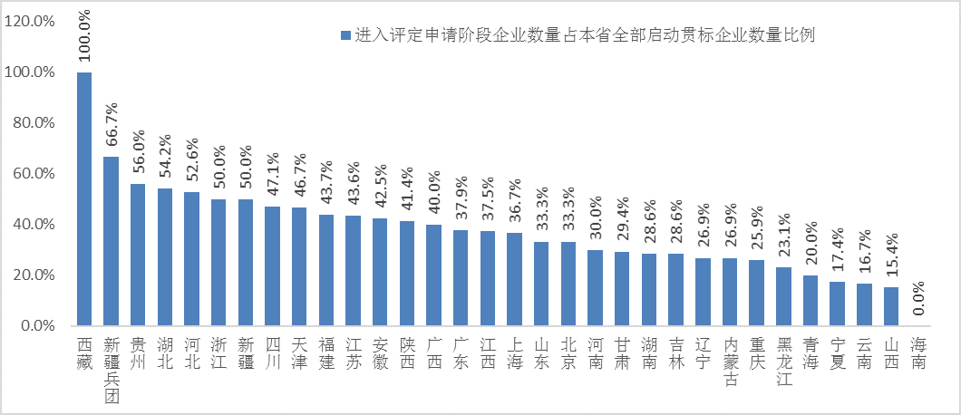 圖1-5 各省進入評定申請階段企業(yè)數(shù)量占本省全部啟動貫標企業(yè)數(shù)量比例(截至2017年1月26日,不包括已經(jīng)通過評定的企業(yè))