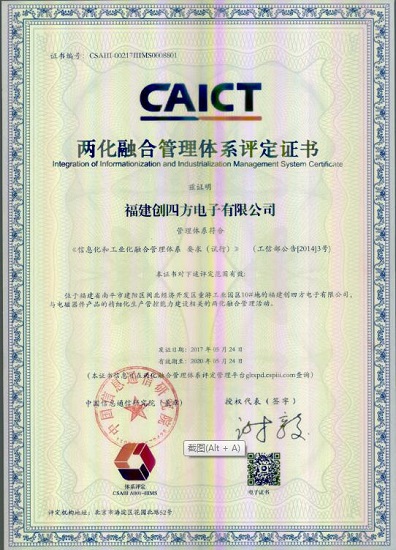2017年5月24日,福建創(chuàng)四方電子有限公司兩化融合管理體系貫標(biāo)工作通過文件初審、現(xiàn)場審核、合規(guī)性審查、專家復(fù)核、公示等環(huán)節(jié),順利獲得兩化融合管理體系評(píng)定證書。兩化融合是信息化與工業(yè)化的高層次的深度結(jié)合。兩化融合管理體系的建立,可以促進(jìn)企業(yè)信息化與工業(yè)化的深度融合,走新型工業(yè)化道路。