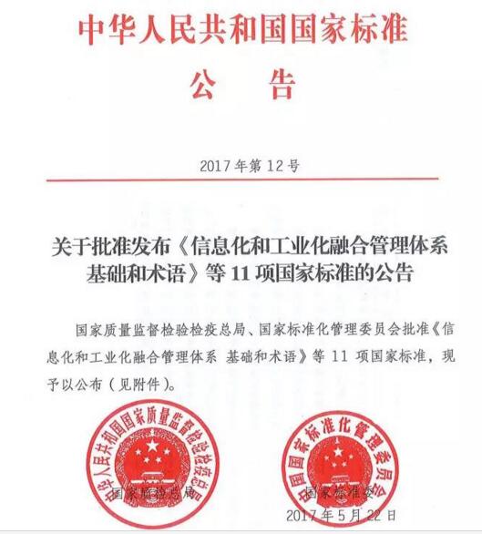 2017年6月7日,信息化和工業(yè)化融合管理體系國家標準發(fā)布會在北京召開,正式發(fā)布GB/T 23000-2017《信息化和工業(yè)化融合管理體系 基礎(chǔ)和術(shù)語》和GB/T 23001-2017《信息化和工業(yè)化融合管理體系 要求》兩項國家標準。工業(yè)和信息化部總工程師張峰,國家標準化管理委員會主任田世宏出席會議并講話。發(fā)布會由工業(yè)和信息化部辦公廳副主任黎烈軍主持,國家標準化管理委員會副主任殷明漢在會上宣讀了2017年第12號中國國家標準公告,工業(yè)和信息化部信息化和軟件服務業(yè)司司長謝少鋒對兩項標準進行了解讀。工業(yè)和信息化部科技司、信軟司、中小企業(yè)局、國際司,國家標準化管理委員會工業(yè)二部等兩化融合管理體系工作領(lǐng)導小組成員單位代表出席會議。