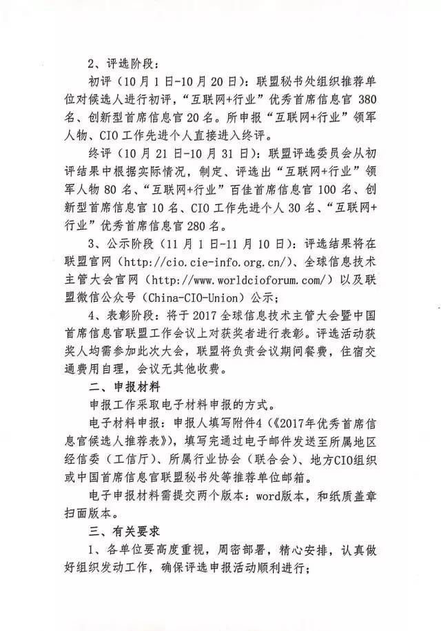 本次評選表彰將會在企業(yè)及事業(yè)單位中評選出“互聯(lián)網(wǎng)+行業(yè)”領(lǐng)軍人物80名、“互聯(lián)網(wǎng)+行業(yè)”百佳首席信息官100名、創(chuàng)新型首席信息官10名、“互聯(lián)網(wǎng)+行業(yè)”優(yōu)秀首席信息官280名;在政府和地方CIO協(xié)會/聯(lián)盟中評選出CIO工作先進個人30名。