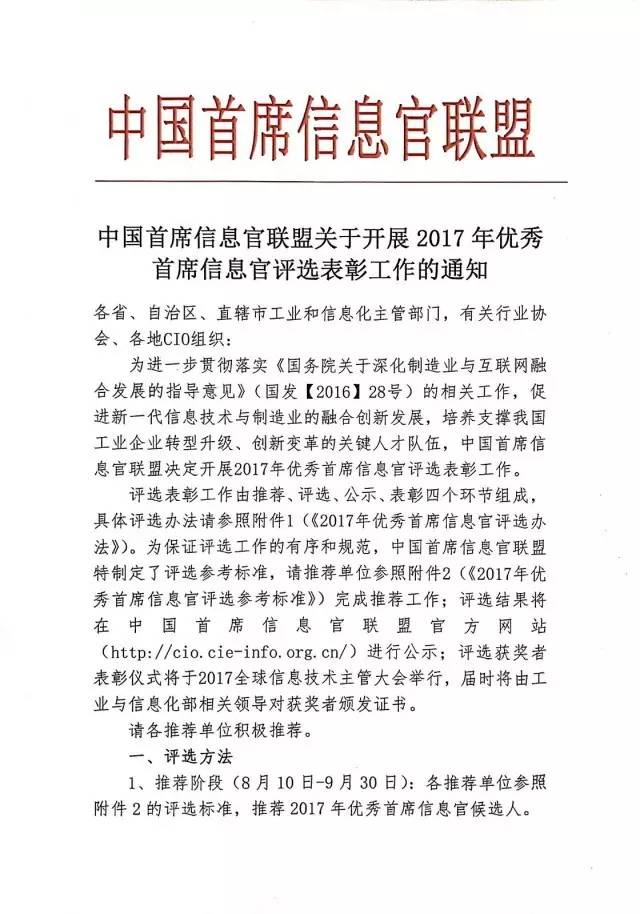 為進一步貫徹落實《國務(wù)院關(guān)于深化制造業(yè)與互聯(lián)網(wǎng)融合發(fā)展的指導(dǎo)意見》(國發(fā)【2016】28號)的相關(guān)工作,促進新一代信息技術(shù)與制造業(yè)的融合創(chuàng)新發(fā)展,培養(yǎng)支撐我國工業(yè)企業(yè)轉(zhuǎn)型升級、創(chuàng)新變革的關(guān)鍵人才隊伍,中國首席信息官聯(lián)盟決定開展2017年優(yōu)秀首席信息官評選表彰工作。