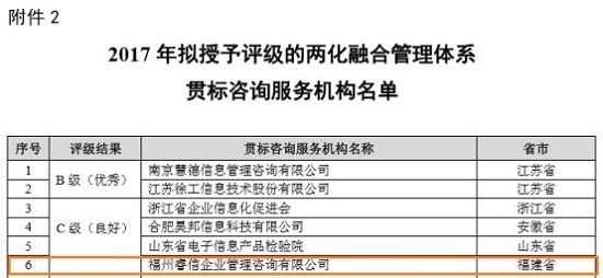 福州睿信公司按照地方工業(yè)信息化工作部署和中國兩化融合服務(wù)聯(lián)盟要求,積極推動企業(yè)兩化融合管理體系貫標(biāo)咨詢服務(wù)工作,得到相關(guān)業(yè)務(wù)主管部門和服務(wù)企業(yè)一致好評。在中國兩化融合服務(wù)聯(lián)盟開展“2017年兩化融合管理體系貫標(biāo)咨詢服務(wù)機構(gòu)評級”活動中,福州睿信公司獲得“C級(良好)”的評價,取得福建省第一名,全國第六名的好成績(見附件2),這不僅是對福州睿信兩化融合服務(wù)工作的認(rèn)可,更是對福州睿信提供兩化融合貫標(biāo)工作專業(yè)服務(wù)水平的肯定。福州睿信會再接再厲,一如既往服務(wù)企業(yè)兩化融合管理體系貫標(biāo)工作,為企業(yè)提高管理效益服務(wù),為地方企業(yè)發(fā)展服務(wù),為促進國家兩化融合管理戰(zhàn)略落地服務(wù)。