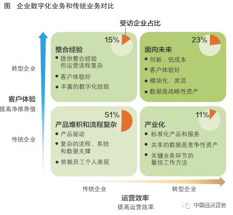 2.產(chǎn)品堆積和流程復(fù)雜。在我們調(diào)研的企業(yè)中,51%的企業(yè)位于圖的左下象限。這些企業(yè)經(jīng)過多年發(fā)展,依靠復(fù)雜的業(yè)務(wù)流程、系統(tǒng)和數(shù)據(jù)支撐,開發(fā)了大量產(chǎn)品和服務(wù)。結(jié)果就是業(yè)務(wù)分散、勞動密集、客戶體驗(yàn)糟糕、產(chǎn)品堆積。