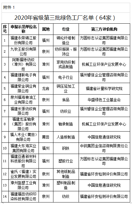 根據(jù)《福建省綠色制造體系創(chuàng)建實(shí)施方案》(閩經(jīng)信環(huán)資〔2018〕248號(hào),以下簡(jiǎn)稱《實(shí)施方案》)及《關(guān)于組織申報(bào)工信部第五批綠色制造名單的通知》(閩工信函節(jié)能〔2020〕105號(hào))要求,省工信廳組織開(kāi)展了福建省第三批綠色制造名單推薦工作。經(jīng)企業(yè)申報(bào)、各設(shè)區(qū)市工信部門推薦、專家評(píng)審、公示、復(fù)核并征求相關(guān)部門意見(jiàn),確定福建省第三批綠色制造名單。日前,省工信廳在官網(wǎng)上對(duì)該名單予以公布:其中綠色工廠64家、綠色供應(yīng)鏈18個(gè)、綠色園區(qū)6個(gè)、綠色設(shè)計(jì)產(chǎn)品20款(具體名單可查閱附件)。 ? 入選綠色制造企業(yè)名單的標(biāo)準(zhǔn)有哪些: 基礎(chǔ)好、代表性強(qiáng)的企業(yè)(參照《綠色工廠評(píng)價(jià)通則》(GB/T36132-2018)及《通知》中綠色工廠評(píng)價(jià)有關(guān)要求)。? 符合工業(yè)和信息化部節(jié)能與綜合利用司對(duì)于“綠色設(shè)計(jì)產(chǎn)品標(biāo)準(zhǔn)清單”的相關(guān)要求。 以產(chǎn)品制造和能源供給為主要功能、工業(yè)增加值占比超過(guò)50%、具有法定邊界和范圍、具備統(tǒng)一管理機(jī)構(gòu)的省級(jí)以上工業(yè)園區(qū),同時(shí)具備工業(yè)基礎(chǔ)好、基礎(chǔ)設(shè)施完善、綠色水平高的條件。 涵蓋汽車、航空航天、船舶、電子電器、通信、大型成套裝備機(jī)械、輕工、紡織、食品、醫(yī)藥、建材、電子商務(wù)、快遞包裝等行業(yè)中代表性強(qiáng)、影響力大、經(jīng)營(yíng)實(shí)力雄厚、綠色供應(yīng)鏈管理基礎(chǔ)好的核心企業(yè)(參照《通知》中綠色供應(yīng)鏈評(píng)價(jià)有關(guān)要求)。 為加快建設(shè)我省綠色制造體系,打造綠色制造先進(jìn)典型,引領(lǐng)相關(guān)領(lǐng)域工業(yè)綠色轉(zhuǎn)型,省工信廳將針對(duì)評(píng)審中發(fā)現(xiàn)的問(wèn)題對(duì)申報(bào)單位進(jìn)行“一企一單”反饋,要求申報(bào)單位進(jìn)一步完善提升,不斷提高我省綠色制造水平。同時(shí),各設(shè)區(qū)市工信局要加強(qiáng)對(duì)綠色制造單位及第三方評(píng)價(jià)機(jī)構(gòu)的指導(dǎo)、監(jiān)督和管理,對(duì)不再符合《實(shí)施方案》要求的單位及第三方評(píng)價(jià)機(jī)構(gòu),應(yīng)及時(shí)向省工信廳報(bào)送有關(guān)情況。 快來(lái)看看你家企業(yè)有沒(méi)有上榜↓↓↓ (名單有點(diǎn)長(zhǎng),請(qǐng)耐心閱讀喲~) ? ? ? ? ? ? 來(lái)源:福建省工業(yè)和信息化廳