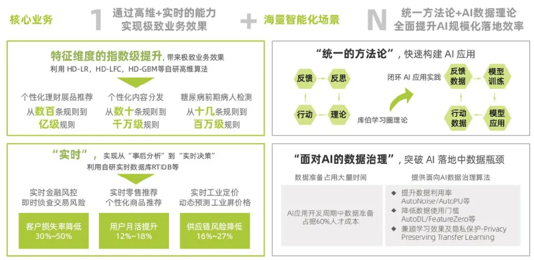 “1”指極致的核心場(chǎng)景。每個(gè)企業(yè)都有1個(gè)或多個(gè)核心業(yè)務(wù),企業(yè)的業(yè)務(wù)一定是和企業(yè)的發(fā)展目標(biāo)相關(guān)的。這些業(yè)務(wù)提升會(huì)帶動(dòng)整個(gè)企業(yè)的提升。面對(duì)這些核心業(yè)務(wù)場(chǎng)景,我們需要將智能化做到“極致的效果”,因?yàn)檫@些領(lǐng)域每提升一個(gè)百分點(diǎn)的效果,對(duì)企業(yè)都至關(guān)重要。