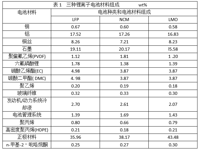 隨著可持續(xù)發(fā)展思想在工業(yè)發(fā)展過程中的不斷深入,人們對產(chǎn)品環(huán)境性能的關(guān)注點逐漸延伸到產(chǎn)品全生命周期的范圍,力求全面了解產(chǎn)品整個生命周期內(nèi)的環(huán)境影響,并通過改善產(chǎn)品生產(chǎn)技術(shù)和工藝過程以合理充分利用自然資源。生命周期評價(Life Cycle Assessment,LCA)作為環(huán)境管理工具,能夠定量地分析產(chǎn)品在原材料獲取階段、制造與裝配階段、使用運行階段、回收處理階段等整個生命周期的環(huán)境影響和能源消耗,從而使企業(yè)對產(chǎn)品的環(huán)境影響有全面的了解和認(rèn)識,實現(xiàn)產(chǎn)品的可持續(xù)發(fā)展。生命周期評價涉及到產(chǎn)品及生產(chǎn)工藝設(shè)計和改進(jìn)的決策、環(huán)境政策制定、廢棄物管理等各個方面。鋰離子電池作為新能源電動汽車的核心部件,在其整個生命周期中會涉及大量的能源輸入和污染物輸出,現(xiàn)有的環(huán)境效益評價研究集中在匹配不同鋰離子電池的電動汽車整車、鋰離子電池內(nèi)部單一部件、匹配電動汽車的磷酸鐵鋰電池與鎳氫電池及磷酸鐵鋰電池與三元電池的比較分析。本文通過匹配某款電動汽車的使用需求,以現(xiàn)有的電動汽車鋰電池,包括磷酸鐵鋰電池(LFP)、錳酸鋰電池(LMO)、鎳鈷錳三元鋰電池(NCM)為研究對象,利用simapro9.0軟件建立生命周期評價模型,進(jìn)行環(huán)境效益評價,為實現(xiàn)電動汽車產(chǎn)業(yè)節(jié)能減排目標(biāo)和可持續(xù)發(fā)展提供參考。