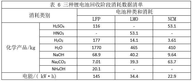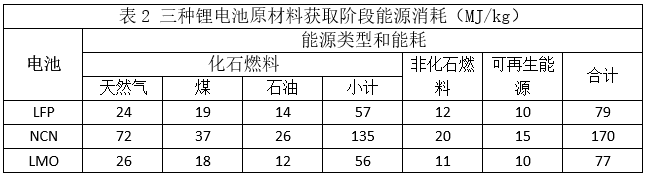 根據(jù)原料生產(chǎn)工藝流程,通過GREET2020軟件得到三種鋰電池原材料獲取階段能源消耗數(shù)據(jù)如表2所示。