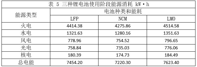 式中:EC(電池)代表鋰電池使用階段電能損耗;M電池代表電池質(zhì)量;M車代表汽車質(zhì)量;EC車代表汽車使用階段汽車總耗電量;η代表充放電效率。根據(jù)本文匹配的純電動汽車參數(shù)和2020年國家統(tǒng)計局公布的我國電力來源統(tǒng)計結(jié)構(gòu),計算得到電動汽車鋰電池生命周期中使用階段的能源消耗如表5所示。
