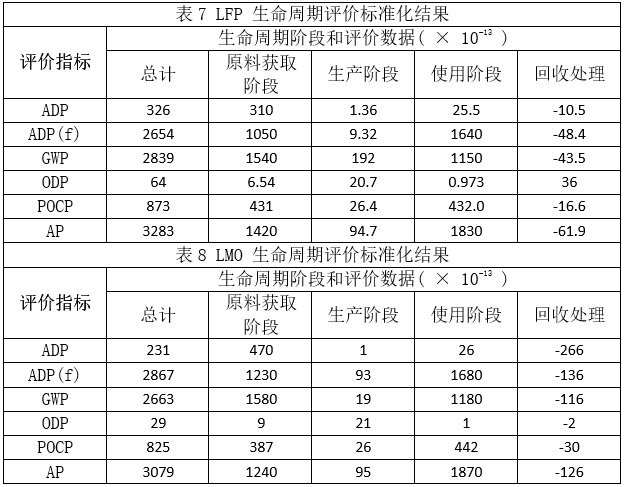 根據(jù)上述生命周期各階段的數(shù)據(jù)清單,在simapro9.0軟件中建立LFP、LMO、NCM的生命周期評價模型,并采用CML-IA baseline評價方法對三種電池的環(huán)境影響指標(biāo)進(jìn)行標(biāo)準(zhǔn)化處理,具體結(jié)果如表7~表9所示。
