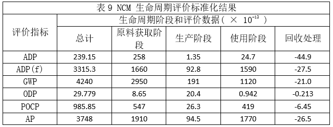 通過三種電池方案的生命周期評價指標(biāo)標(biāo)準(zhǔn)化結(jié)果(表7~表9)的對比可以明顯看出,在匹配同一款電動汽車的條件下,LFP的非生物資源消耗最大,其次是NCM和LMO;NCM的化石能源消耗最大,其次是LMO和LFP。為滿足不同方案下純電動汽車動力性的要求,在保證三款動力電池的能量相同情況下,因三款電池的比功率不同,相對于其他兩款電池,NCM質(zhì)量最小,在原材料獲取上占有優(yōu)勢,非生物資源消耗減少,但其化石資源的消耗最高。每種鋰電池的兩種資源消耗評價指標(biāo)占比為:LFP中ADP占比11%、ADP(f)占比89%;LMO中ADP占比7%、ADP(f)占比93%;NCM中ADP占比7%、ADP(f)占比93%??梢娀Y源消耗是主要的資源消耗方式。