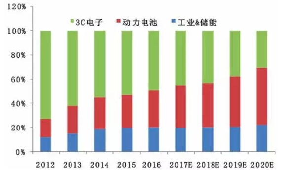 據(jù)統(tǒng)計數(shù)據(jù),全球傳統(tǒng)3C電子需求在鋰電池中的占比從2012年的80%下降到2015年的53%,而受益于新能源汽車的快速發(fā)展,動力鋰電占比從11%上升到28%,未來這一趨勢還將延續(xù),預計到2020年,動力類占比將達到47%。