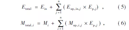 其中,Ein為能源總消耗量,由公式(1)和公式(2)計算得出,αj為工藝燃料總消耗量中第j種工藝燃料所占的比例,βk,j為在所有使用第j種工藝燃料的設備中第k種設備所占的比例。需要注意的是,燃料周期上游的總能耗和總排放除了來源于燃燒消耗,還應將工藝燃料的生命周期上游階段納入考慮范圍,因為工藝燃料作為一種燃料,也經(jīng)歷了一系列同樣的生產方式。綜上,燃料周期上游的總能耗(Etotal)和總排放(Mtotal,i)的計算公式為