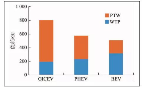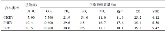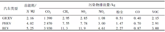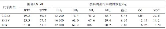 GICEV、PHEV和BEV在整個燃料周期的能耗分別為:803 GJ、575 GJ和510 GJ。由圖2可知,相對于GICEV,PHEV和BEV兩種新電動汽車的能耗均有不同程度地降低:PHEV降低了28.35%;BEV節(jié)能效果最顯著,降低了36.45%。WTP階段,相對于傳統(tǒng)汽車,PHEV和EBV兩種電動汽車更加耗能,其中BEV能耗最高,比GICEV高出64.94%,這主要是由于電能的生產需要消耗大量的一次能源,我國以燃煤發(fā)電為主,而煤電的效率僅有40%左右,轉化時損失了大部分能量。PTW階段,PHEV和BEV能耗分別為GICEV的56.15%和31.56%,體現(xiàn)出明顯的節(jié)能優(yōu)勢。這是由于行駛過程中汽油燃燒的能量損耗非常嚴重,而電能的燃料經(jīng)濟性優(yōu)于汽油,能量轉化效率較高。因此,在車輛行駛階段使用電動汽車有利于節(jié)能保。