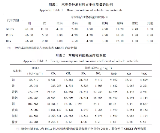 1)車輛主體。汽車的整備質量是汽車在正常條件準備行駛時的重量(油箱裝有90%的燃油),并包括隨車附件(備胎、隨車工具等)。本文假設GICEV和PHEV的整備質量中含有30 kg的汽油,將汽油、流體、電池和輪胎質量一并扣除,得出GICVE、PHEV和BEV的剩余質量(主體質量)分別為:1 136 kg、1 495 kg和1 491 kg。計算車輛制造過程的能耗和排放需要材料組分和材料能耗數(shù)據(jù)。如附表1所示,共8種主要材料,假設均為原生材料;材料能耗及排放情況如附表2所示。