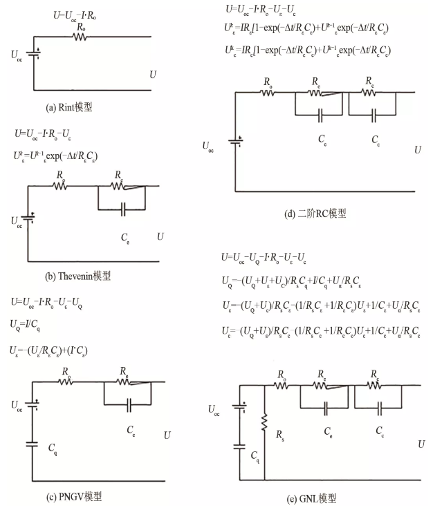 等效電路模型通過線型變參數(shù)的電路模型模擬鋰離子電池非線性工作特性,計算簡單且模擬精度較高,是當前實用性較好的鋰離子電池建模方法。目前已有的等效電路模型有:Rint模型、Thevenin模型、二階RC模型、PNGV模型和GNL模型,其電路圖如圖1所示。
