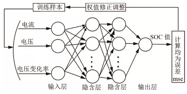 基于黑箱模型的電池SOC估算,采用現(xiàn)在的研究熱門的人工智能技術,主要應用的方法有:神經(jīng)網(wǎng)絡、支持向量機、模糊控制等。以神經(jīng)網(wǎng)絡方法為例,BP(back propagation)神經(jīng)網(wǎng)絡方法在非線性逼近問題中應用較為成熟,適用于模式識別、故障檢測和線性擬合等領域。在鋰離子電池SOC估算中,采用BP神經(jīng)網(wǎng)絡方法的模型如圖2所示,其算法流程如圖3所示。通過其他參數(shù)推算SOC,例如:電壓、電流、電壓變化率、內阻、溫度等。由于神經(jīng)網(wǎng)絡參數(shù)優(yōu)化遵循經(jīng)驗風險最小原則,導致其泛化性能不佳。支持向量機方法相對于神經(jīng)網(wǎng)絡方法,采用基于結構風險最小化的監(jiān)督學習算法,具有更好的泛化性能。