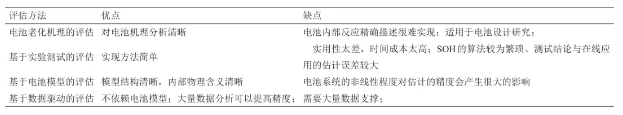 通過對電池健康狀態(tài)估算方法的闡述,對上述方法的優(yōu)缺點進行分析,結論如表4所示,可見基于電池模型的評估是當前廣泛應用的成熟方案,基于數(shù)據(jù)驅動的評估方法正處于研究熱點。