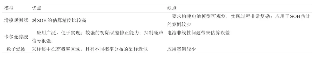 表5? ?鋰離子電池SOH基于電池模型評估采用的數(shù)學方法優(yōu)缺點對比
