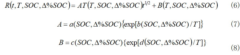 在4.1節(jié)中提到的經(jīng)驗衰退模型,主要有兩種類型:基于阻抗變化的循環(huán)壽命模型和基于容量衰退的剩余壽命模型?;谧杩棺兓难h(huán)壽命模型,通過電池電阻與溫度改變及SOC與ΔSOC的變化,推導出了循環(huán)壽命完全經(jīng)驗模型,如式(6),(7),(8)所示