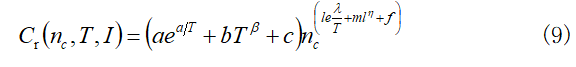 通過加速壽命試驗的研究,以溫度和充放電電流為加速應力,得到模型見式(9)