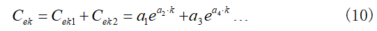 式中,Cck和Cpk分別為指數(shù)模型和多項式模型得到的電池在第k次循環(huán)是的額定容量。a1、a2、a3、a4和b1、b2、b3、b4為未知模型參數(shù),通過參數(shù)辨識得到。根據(jù)容量衰退數(shù)據(jù),結合鋰離子電池內部電化學反應原理參數(shù),給出電池容量衰減模型如式(12)所示