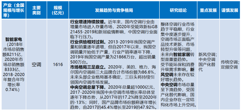 空調(diào)行業(yè)。整體市場(chǎng)趨于平穩(wěn)期,行業(yè)集中度逐步提升,空調(diào)市場(chǎng)正面臨產(chǎn)品技術(shù)更新、市場(chǎng)轉(zhuǎn)型升級(jí)等問題,未來向智能家居轉(zhuǎn)型是重要趨勢(shì)。新風(fēng)空調(diào)和中央空調(diào)國產(chǎn)化替代存在增長空間。