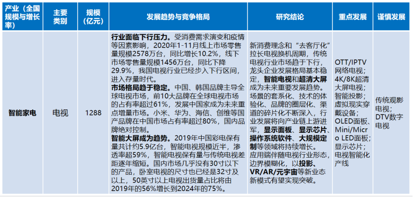 電視行業(yè)。傳統(tǒng)電視行業(yè)市場(chǎng)趨于下行,龍頭企業(yè)發(fā)展格局基本穩(wěn)定,智能電視和超清大屏成為未來重要發(fā)展趨勢(shì)。場(chǎng)景的套系化、技術(shù)的體驗(yàn)化、品牌的圈層化、渠道的碎片化不斷深入,行業(yè)發(fā)展將向產(chǎn)業(yè)鏈上游進(jìn)軍,顯示面板、顯示芯片、操作系統(tǒng)軟件、大規(guī)模定制等領(lǐng)域?qū)⒊掷m(xù)增長。應(yīng)用端伴隨電視行業(yè)形態(tài),邊界模糊化,投影、VR/AR/元宇宙等新業(yè)態(tài)新模式有望實(shí)現(xiàn)突破。
