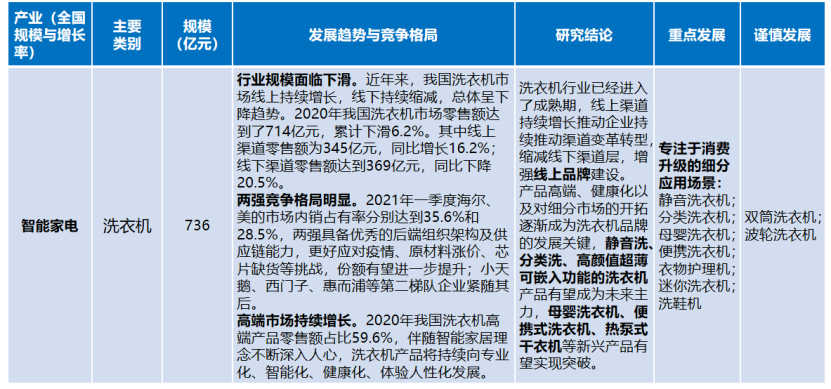 洗衣機(jī)行業(yè)。整體已經(jīng)進(jìn)入成熟期,線上渠道持續(xù)增長推動(dòng)企業(yè)持續(xù)推動(dòng)渠道變革轉(zhuǎn)型,縮減線下渠道層,增強(qiáng)線上品牌建設(shè)。產(chǎn)品高端、健康化以及對(duì)細(xì)分市場(chǎng)的開拓逐漸成為洗衣機(jī)品牌的發(fā)展關(guān)鍵,靜音洗、分類洗、高顏值超薄可嵌入功能的洗衣機(jī)產(chǎn)品有望成為未來主力,母嬰洗衣機(jī)、便攜式洗衣機(jī)、熱泵式干衣機(jī)等新興產(chǎn)品有望實(shí)現(xiàn)突破。