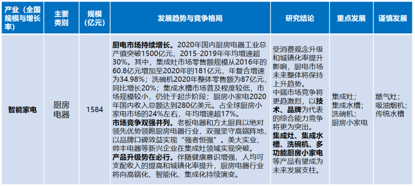 廚房電器行業(yè)。受消費(fèi)觀念升級(jí)和城鎮(zhèn)化率提升影響,廚電市場(chǎng)未來整體將保持上升趨勢(shì)。中端市場(chǎng)競(jìng)爭(zhēng)將更趨激烈,以技術(shù)、品牌為代表的綜合能力競(jìng)爭(zhēng)將更為突出。集成灶、集成水槽、洗碗機(jī)、多功能廚房小家電等產(chǎn)品有望成為未來發(fā)展支柱。