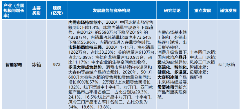 冰箱行業(yè)。內(nèi)需市場(chǎng)基本趨于飽和,外銷市場(chǎng)逐年遞增,出口形勢(shì)較好。消費(fèi)升級(jí)背景下,國內(nèi)冰箱產(chǎn)品升級(jí)成為必然趨勢(shì),高端化、智能化、健康化、多溫區(qū)、大容積冰箱產(chǎn)品未來將持續(xù)發(fā)展,母嬰冰箱等新興產(chǎn)品有望實(shí)現(xiàn)突破。