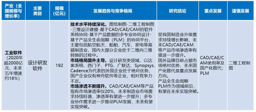 設(shè)計(jì)研發(fā)軟件。受我國制造業(yè)升級(jí)需求持續(xù)增長影響,未來CAD/CAE/CAM等產(chǎn)品市場(chǎng)滲透率有望進(jìn)一步提升。國外品牌目前占據(jù)市場(chǎng)絕對(duì)優(yōu)勢(shì),未來國產(chǎn)化替代是重點(diǎn)發(fā)展方向。產(chǎn)品全生命周期PLM作為領(lǐng)域前沿,有望在未來實(shí)現(xiàn)突破。