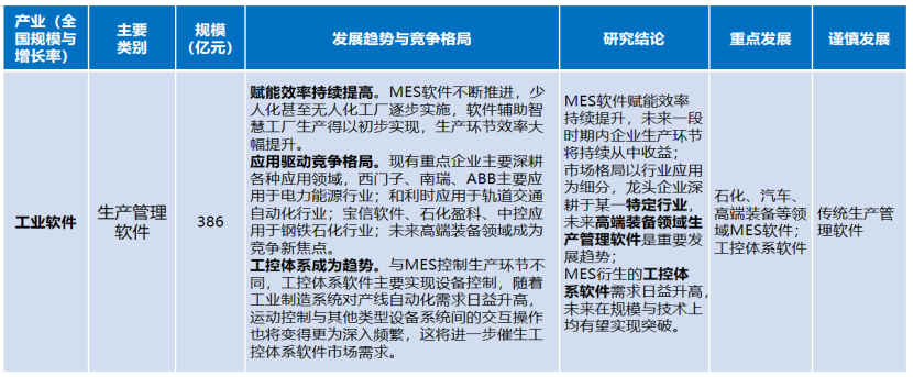 生產(chǎn)管理軟件。MES軟件賦能效率持續(xù)提升,未來一段時(shí)期內(nèi)企業(yè)生產(chǎn)環(huán)節(jié)將持續(xù)從中收益;市場(chǎng)格局以行業(yè)應(yīng)用為細(xì)分,龍頭企業(yè)深耕于某一特定行業(yè),未來高端裝備領(lǐng)域生產(chǎn)管理軟件是重要發(fā)展趨勢(shì);MES衍生的工控體系軟件需求日益升高,未來在規(guī)模與技術(shù)上均有望實(shí)現(xiàn)突破。
