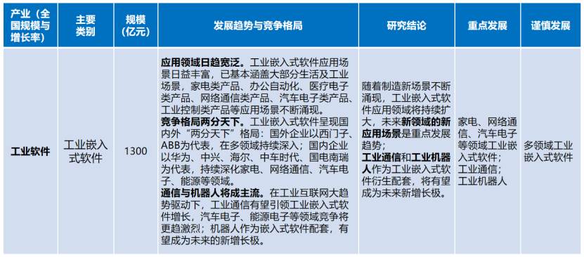 工業(yè)嵌入式軟件。隨著制造新場(chǎng)景不斷涌現(xiàn),工業(yè)嵌入式軟件應(yīng)用領(lǐng)域?qū)⒊掷m(xù)擴(kuò)大,未來新領(lǐng)域的新應(yīng)用場(chǎng)景是重點(diǎn)發(fā)展趨勢(shì);工業(yè)通信和工業(yè)機(jī)器人作為工業(yè)嵌入式軟件衍生配套,將有望成為未來新增長極。
