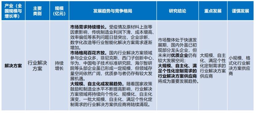 行業(yè)解決方案。市場(chǎng)整體處于快速發(fā)展期,國內(nèi)外雖已初現(xiàn)部分龍頭企業(yè),但未來對(duì)優(yōu)質(zhì)企業(yè)仍有較大發(fā)展空間;大規(guī)模、自主化、滿足個(gè)性化定制需求的行業(yè)解決方案供應(yīng)商將成為重要發(fā)展趨勢(shì)。