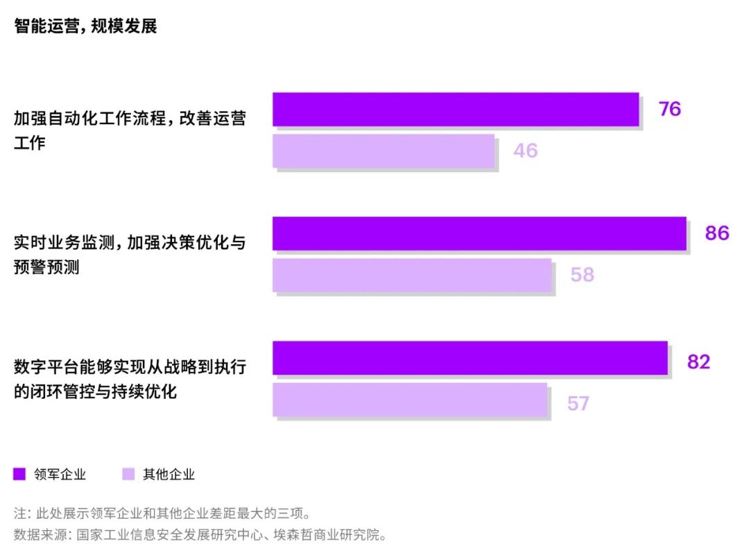 在運(yùn)營(yíng)重塑的過程中,智能化是決定運(yùn)營(yíng)重塑成功與否的關(guān)鍵能力。研究數(shù)據(jù)顯示,轉(zhuǎn)型領(lǐng)軍企業(yè)不斷加強(qiáng)工作流程的自動(dòng)化,實(shí)時(shí)進(jìn)行業(yè)務(wù)檢測(cè),以優(yōu)質(zhì)的多元化信息,制定數(shù)據(jù)驅(qū)動(dòng)型決策,加強(qiáng)決策優(yōu)化與預(yù)警預(yù)測(cè)并搭建數(shù)字平臺(tái),對(duì)企業(yè)運(yùn)營(yíng)實(shí)現(xiàn)閉環(huán)管控與動(dòng)態(tài)優(yōu)化(見下圖)。