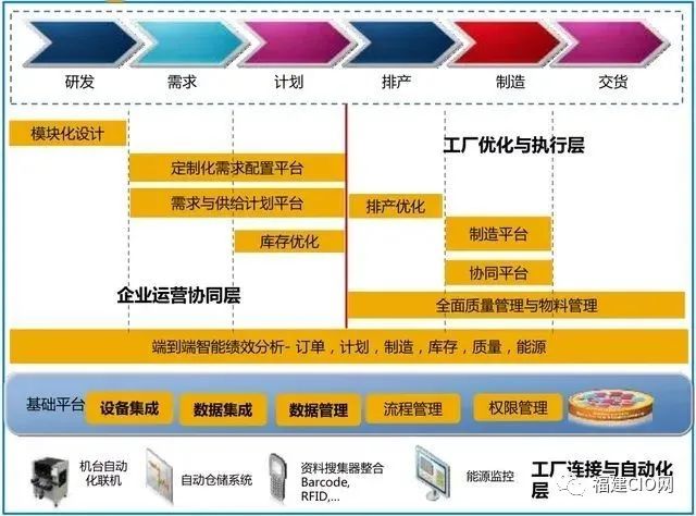 在這里我想先強調(diào)一點,即有些內(nèi)容是屬于企業(yè)在信息化建設(shè)階段就需要完成的事情,最典型的就是類似基礎(chǔ)平臺建設(shè),圍繞ERP的橫向價值鏈信息化,圍繞MES為核心的縱向信息化,同時橫向和縱向的集成和協(xié)同等。還有就是基于傳統(tǒng)IT的BI或大數(shù)據(jù)分析平臺建設(shè)等。