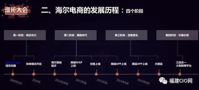 在海爾分享自己的數(shù)字化轉(zhuǎn)型經(jīng)驗的時候,談到了海爾電商發(fā)展的四個階段,即從最早的電商平臺建設(shè)到后期的生態(tài)整合,如下:
