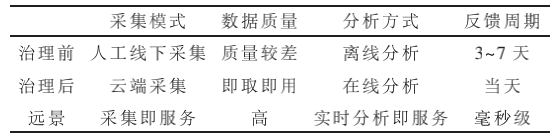 開展數據治理前,數據分析的周期長、工作量大,分析的數據量也比較有限。在實施數據治理之后,采用云端采集和在線分析,代替過去手動采集和離線分析的方式,同時保證了數據的準確性和完整性,大大減少分析人員在繁瑣的數據預處理任務中耗費的時間。數據治理前后對比如表1所示。