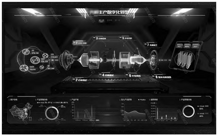 企業(yè)運營大屏展現了企業(yè)光棒、光纖、光纜的原料、生產、檢驗、倉儲、銷售等關鍵環(huán)節(jié)的信息。