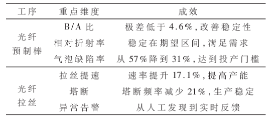 目前,企業(yè)在光纖預制棒、光纖拉絲中有諸多方面的提升,如表2所示。其中在光纖預制棒階段,生產過程中內部形成雜質和氣泡,會嚴重影響后續(xù)光纖拉絲過程。經數據治理后,數據質量提高,通過數據分析與建模,不斷優(yōu)化生產工藝,有效降低預制棒的氣泡缺陷率,改善光纖預制棒的均勻性和重復性,良品率大幅度提升,達到投產門檻;在光纖拉絲階段,在拉絲提速、塔斷及告警反饋等方面的業(yè)務痛點方面有明顯的改善,拉絲良品率有效提升。