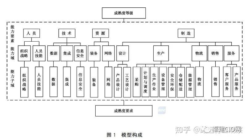 首先,明確智能制造能力成熟度模型的評(píng)價(jià)對(duì)象和構(gòu)成。模型的評(píng)價(jià)對(duì)象為致力于提升自身智能制造能力的企業(yè)。對(duì)于“智能制造能力intelligent manufacturing capability”給出了如下定義:為實(shí)現(xiàn)智能制造的目標(biāo),企業(yè)對(duì)人員、技術(shù)、資源、制造等進(jìn)行管理提升和綜合應(yīng)用的程度。值得注意的是,定義中提出的人員、技術(shù)、資源和制造即是成熟度等級(jí)的四個(gè)能力要素,四個(gè)能力要素由組織戰(zhàn)略、數(shù)據(jù)等12個(gè)能力域來(lái)支撐,而能力域又由采購(gòu)、生產(chǎn)、物流等20個(gè)能力子域來(lái)支撐,即4個(gè)能力要素、12個(gè)能力域和20個(gè)能力子域構(gòu)成了整個(gè)成熟度模型。