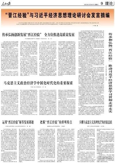 今天出版的《人民日報(bào)》9版“理論”,整版刊登《“晉江經(jīng)驗(yàn)”與習(xí)近平經(jīng)濟(jì)思想理論研討會(huì)發(fā)言摘編》。以下是版面內(nèi)容的摘登: