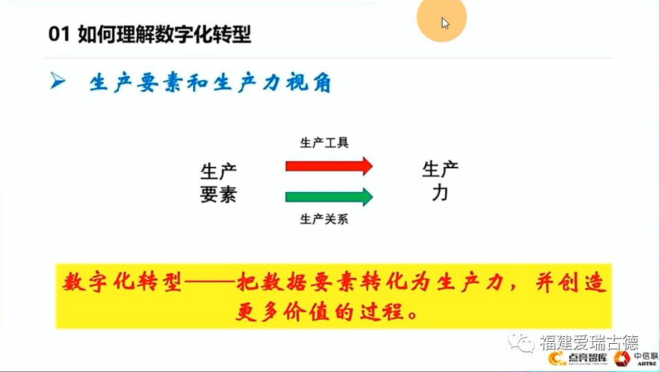 我們大家都知道慈禧太后也坐過汽車,大家可能有看過這個報道。故宮里頭也拉過電線,也裝過電燈,說明什么呢?說明在清末,內(nèi)燃機和電這些技術(shù)已經(jīng)傳到了中國。但是為什么那個時候在中國沒有像國外一樣,像西方一樣帶來第二次工業(yè)革命的浪潮呢?93年的諾貝爾經(jīng)濟學(xué)獎的得主,美國的諾斯教授的研究成果很好的解釋了這個問題。他的研究成果說制度的創(chuàng)新,包括一些機制的保障是催生社會進(jìn)步的一個根本的原因。在這個基礎(chǔ)上才會有一些技術(shù)的發(fā)明、創(chuàng)新不斷的迭代,那這個是什么呢?就是生產(chǎn)關(guān)系,所以說數(shù)字化轉(zhuǎn)型是什么呢?是把生產(chǎn)要素轉(zhuǎn)化為生產(chǎn)力,創(chuàng)造價值。我們現(xiàn)在碰到的是什么呢?數(shù)據(jù)都在上面,我們系統(tǒng)也都上了,IT這個數(shù)據(jù)都在哪兒呢?都在系統(tǒng)里頭沉淀,我們工具有了,可為什么沒有形成價值呢?因為缺少生產(chǎn)關(guān)系的一個調(diào)整。這也是為什么國內(nèi)改革開放之后,中國的經(jīng)濟快速發(fā)展。因為當(dāng)時進(jìn)行制度創(chuàng)新,還有一個包產(chǎn)到戶,也就是確權(quán)。所以說現(xiàn)在大數(shù)據(jù)局為什么會成為一個局?因為任何一個生產(chǎn)要素,不管是土地,還是技術(shù),還是勞動力,我們都應(yīng)當(dāng)有相應(yīng)的部門。大數(shù)據(jù)也是一樣,它首先是大數(shù)據(jù),也有一個確權(quán)的問題,只有確權(quán)了以后才有可能激發(fā)大家的積極性。這是從生產(chǎn)要素和生產(chǎn)力的視角。?