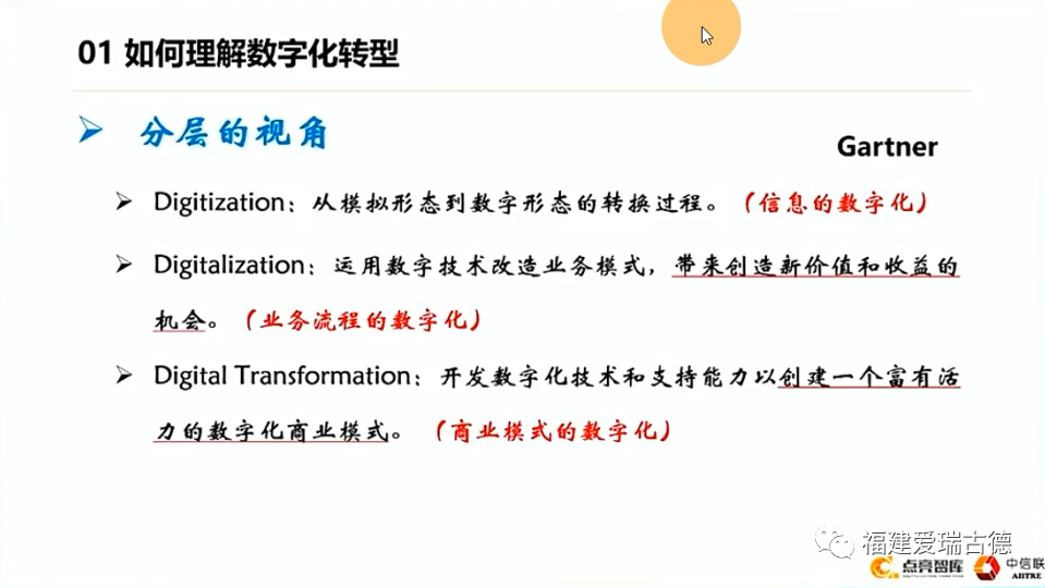 我們從另一個視角——分層的這個視角來說,是引用了“從模擬形態(tài)到數(shù)字形態(tài)的轉(zhuǎn)換過程”。從膠片攝影到數(shù)碼攝影,從賬本記賬到會計電算化,這是信息的一個數(shù)字化。第二個層次是業(yè)務(wù)流程的數(shù)字化,業(yè)務(wù)流程的數(shù)字化是什么呢?是把我們線下的一些業(yè)務(wù)模式、業(yè)務(wù)流程變到線上。20年前,如果大家在企業(yè)可能有直觀的一些感受,就是從接訂單了以后,首先要做的是什么呢?要登記一個臺賬。所有的企業(yè)都有臺賬,有劃分為銷售臺賬、采購臺賬,當(dāng)然倉庫更需要有倉庫和財務(wù)。第一個是登記臺賬,第二個是要開單,要把銷售訂單要開到生產(chǎn)、采購,要開到倉庫,開到各個部門。那我們現(xiàn)在不用做這個事情了,現(xiàn)在是通過ERP來實現(xiàn)。實現(xiàn)了只要有一個銷售訂單,我們就會系統(tǒng)錄入。一敲回車,它會并發(fā)推送到不同節(jié)點的業(yè)務(wù)部門。那改變了什么呢?原來在線下需要一個個部門去通知,現(xiàn)在可以并行。效率提升了。就像我們OA審批一樣。但這個是典型的業(yè)務(wù)數(shù)字化,只是把我們原來線下的流程變到了線上,原來的表單和記錄線下的紙質(zhì)的變到電子版了,所以我為什么把后頭半句話畫了一條橫線。這還遠(yuǎn)遠(yuǎn)不是我們說的真正意義上的業(yè)務(wù)流程的數(shù)字化,而是在這個基礎(chǔ)上要帶來創(chuàng)造新價值的機會,也就是這些數(shù)據(jù)(新型生產(chǎn)要素)要開發(fā)利用起來。第三個就是商業(yè)模式創(chuàng)新。這個很容易理解,從電商的產(chǎn)生,再到京東和天貓兩大巨頭電商平臺出現(xiàn),而后拼多多又異軍突起,都是一種新的商業(yè)模式的產(chǎn)生,這也是一種數(shù)字化轉(zhuǎn)型的形式。?