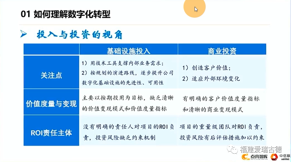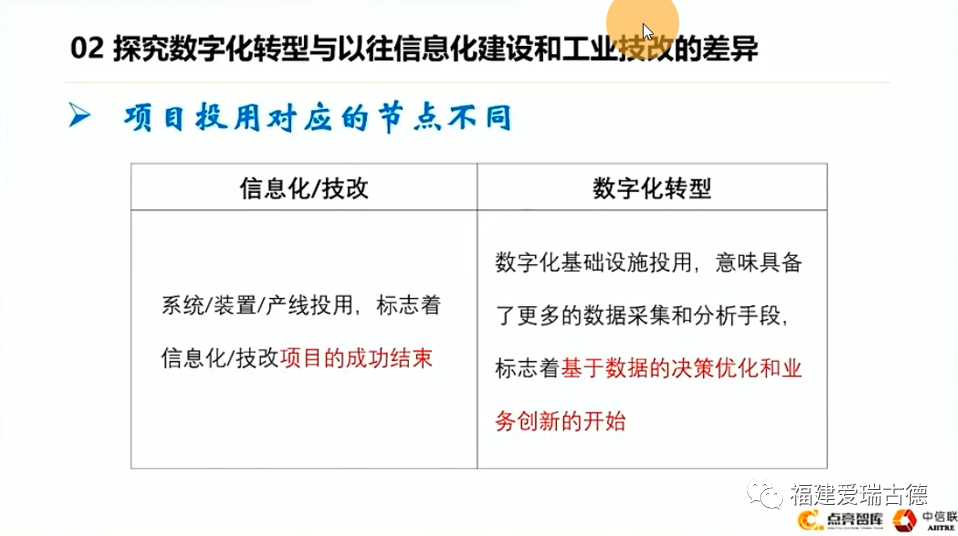 再一個,從這個價值度量和變現(xiàn)的角度來說,基礎(chǔ)設(shè)施我們考慮更多的是按期投用這個項目,時間節(jié)點、里程碑需要什么。在時間節(jié)點交付什么東西。至于交付了以后怎么變現(xiàn),怎么創(chuàng)造價值,可能不是這個部門考慮的。但是對于商業(yè)投資來講,從一開始就需要有很明確的一個商業(yè)模式,要想清楚如何去變現(xiàn),以及有什么樣的價值??蛻魞r值的度量指標(biāo)從一開始的商業(yè)設(shè)計就應(yīng)開始。這也是互聯(lián)網(wǎng)思維,會考慮投資回報率。在原來基礎(chǔ)設(shè)施的時候,很多東西投了就投了,最后沒有價值產(chǎn)生的,反正我們內(nèi)部解決了。至于誰來負(fù)責(zé),我們沒有一個明確的,誰能對投資回報率負(fù)責(zé)。同時對于這種風(fēng)險的約束也缺乏一個明顯的機制。作為商業(yè)投資,類似產(chǎn)品經(jīng)濟,一個人或者一個團(tuán)隊,他要負(fù)責(zé)整個產(chǎn)品從策劃到上市到退市全過程的看護(hù)。這個主體是對整個商業(yè)投資負(fù)責(zé)的一個主體。我們說的另外一個角度,我們說的信息化也好,技改也好,跟我們說的數(shù)字化轉(zhuǎn)型還有什么區(qū)別呢?第一個,對于項目投用、設(shè)備上線意味著什么?在原來意味著這個項目成功結(jié)束,可以開慶功宴了。但是對于數(shù)字化轉(zhuǎn)型意味著剛具備了采集數(shù)據(jù)的手段,剛把這些數(shù)據(jù)采集出來。放在系統(tǒng)里,還沒有開始加工利用,所以這只是數(shù)字轉(zhuǎn)型的開始。
