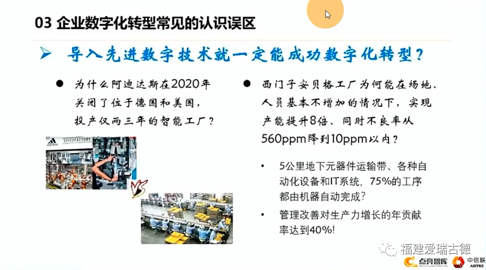 但數(shù)字轉(zhuǎn)型是不是已經(jīng)導(dǎo)入先進(jìn)的數(shù)字技術(shù),就一定是成功的數(shù)字轉(zhuǎn)型?首先,我們看到一個例子,阿迪達(dá)斯在2000年疫情的時候關(guān)閉了美國和德國僅投產(chǎn)兩三年的這個快速工廠??焖俟S實際上就是我們說的質(zhì)量工廠。那關(guān)閉工廠什么概念呢?大家都在企業(yè)里頭,在座的各位企業(yè)家都清楚,設(shè)備一旦安裝調(diào)試完了,你上線使用了哪怕一天、一個禮拜、一個月,然后你再想賣,那就是二手的。因為什么呢?你上線了以后再去停產(chǎn),這個投入基本上就沒有什么殘值了,但他為什么還要關(guān)掉它。因為他如果不關(guān)他賠的錢更多,所以老外做生意不光是看經(jīng)營規(guī)模和收益,而是看回款,看利潤率,劃不來的就要關(guān)掉。