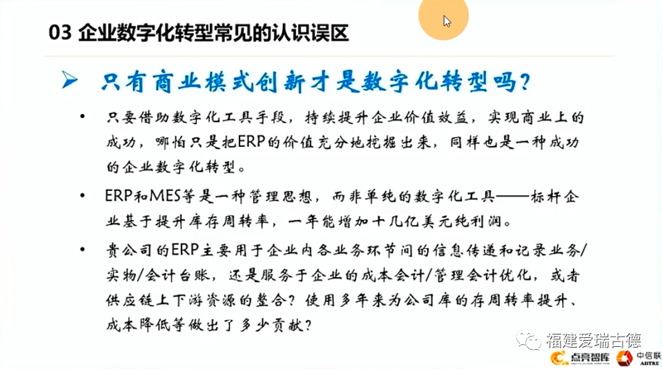 但是不是只有商業(yè)模式創(chuàng)新才是數(shù)字化轉(zhuǎn)型?我個人覺得這個觀點不全對,大家可以參考。只要是借助數(shù)字化工具手段,持續(xù)提升企業(yè)的價值效益,實現(xiàn)商業(yè)上的這種成功。哪怕只是把ERP的價值挖掘出來也是一種成功的數(shù)字化轉(zhuǎn)型。為什么呢?因為ERP和MES等都是一種管理思想,絕對不是一種單純的IT工具。標(biāo)桿企業(yè)比如說華為,我記得前年在這個會場上,華為的領(lǐng)導(dǎo)分享他們經(jīng)驗,他們基于庫存周轉(zhuǎn)率提升,一年增加10億美元,當(dāng)然實際上不止這一個指標(biāo)。做集成供應(yīng)鏈的時候是一系列指標(biāo),所有指標(biāo)體系里絕大多數(shù)指標(biāo)是來源于當(dāng)時使用的ERP系統(tǒng),還有一些其他的系統(tǒng)。同樣我們在企業(yè)里頭的ERP系統(tǒng)數(shù)據(jù)有多少用起來了?我們現(xiàn)在公司主要用于信息的傳遞,還有一個臺賬,服務(wù)于我們的成本會計、管理會計。但現(xiàn)在還有多少企業(yè)用了ERP,用了很多年自己的成本還核算不清楚,你能核算到什么級別?能核算到哪個事業(yè)部?還是能核算到哪個產(chǎn)線、哪個車間,你核算到什么顆粒度,你的管理精細(xì)化就到什么顆粒度。那我們是不是在整合供應(yīng)鏈。因為ERP和MES最大的區(qū)別就是ERP延伸出了企業(yè),跨出企業(yè)上下游的一個整合。我們不管內(nèi)部的成本會計也好,管理會計也好,還是說商業(yè)整合,企業(yè)的ERP發(fā)揮了多大的價值?為公司庫存周轉(zhuǎn)率、成本降低帶來了多少貢獻(xiàn)?咱們在座的企業(yè)家可以去評估一下。